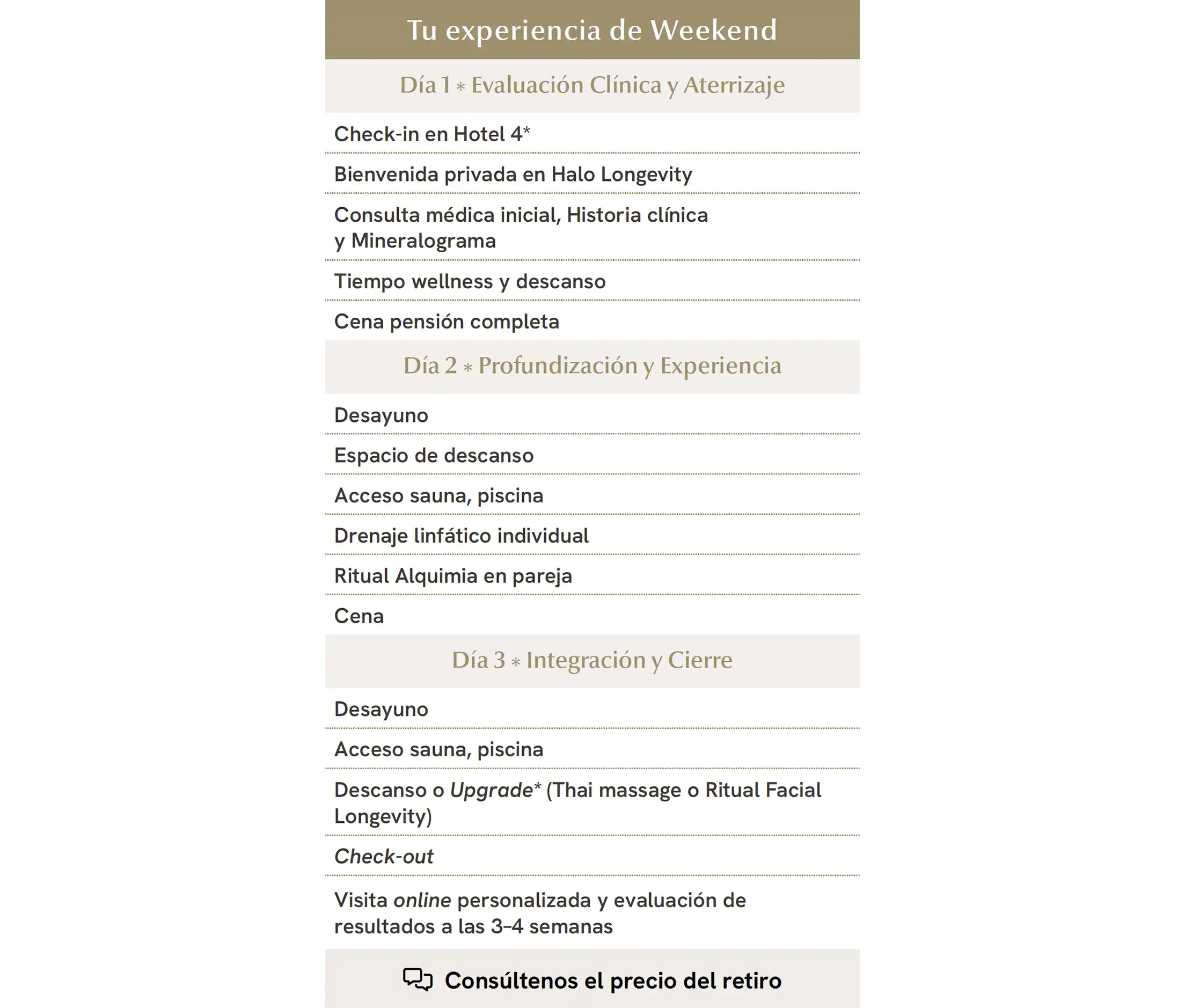 Este programa combina diagnóstico médico avanzado, evaluación de biomarcadores y experiencia sensorial para establecer una estrategia personalizada de longevidad.