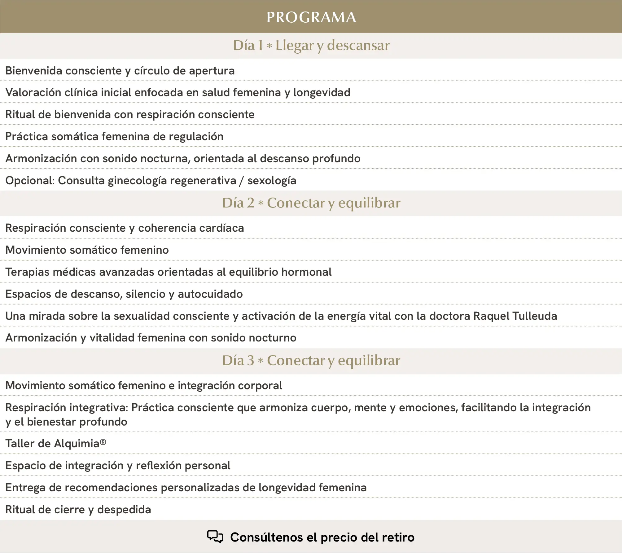 Una experiencia regenerativa que combina medicina de longevidad, prácticas somáticas y descanso profundo para restaurar la capacidad natural de autorregulación del cuerpo y recuperar la claridad mental desde la calma neurofisiológica.